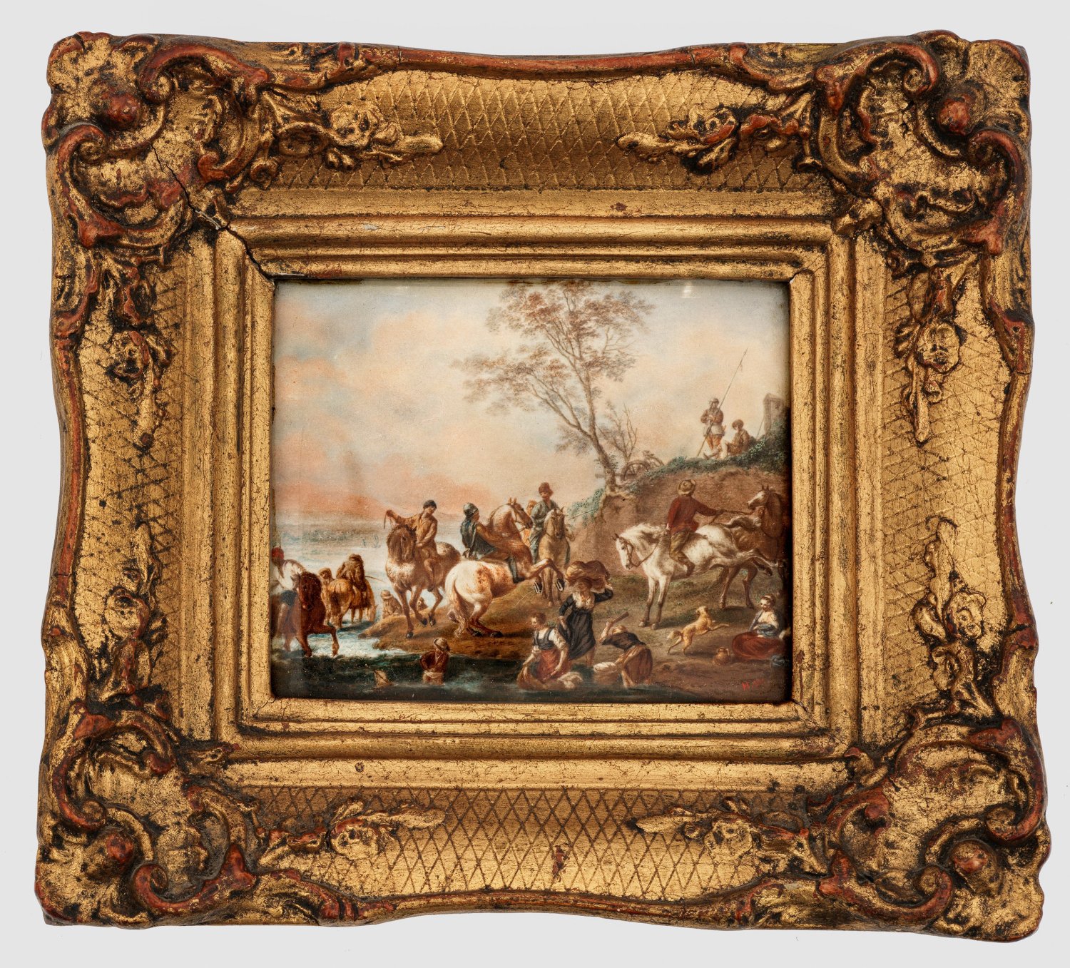 im Stil von Philips Wouwerman. An einem Strand eine Gruppe Reiter, mehrere Wäsche waschende Frauen und ein springender Hund vor einer Düne mit in den dämmernden Himmel ragendem Baum und Fahnenträger. Temperamalerei auf Papier. Vergoldeter Holzrahmen mit Rocaille- und Blumenornamenten. Mit Rahmen 18 cm x 16 cm.