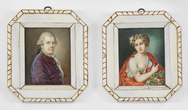 Porträts eines Mannes und einer jungen Frau. Der Mann im Halbprofil, mit weißer Perücke und weißem Spitzenhemd unter violettblauem Gehrock, die junge Frau mit nach rechts gewandtem Oberkörper nach links blickend, gewandet in ein freizügiges antikisierendes Kostüm, in der rechten Hand einen Lorbeerkranz haltend. Tempera auf Elfenbein. 13 cm x 15 cm. Breite Elfenbeinrahmen; rechtwinklig mit abgeschnittenen Ecken und ornamentalen Einschnitten in den äußersten Randwulst.