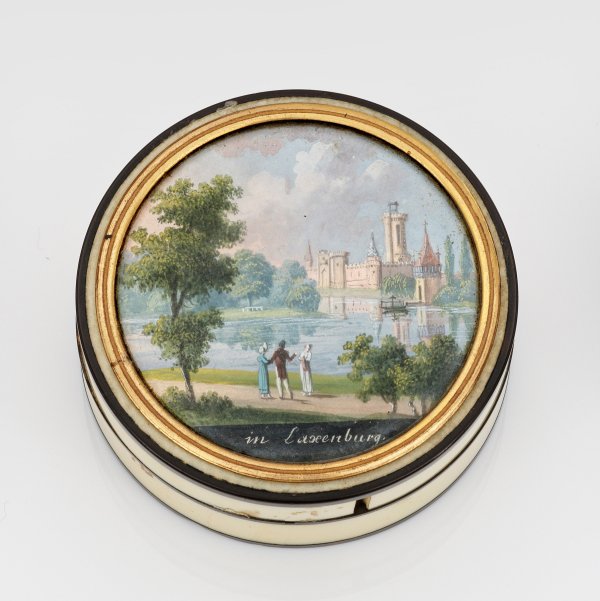 Elfenbeinkorpus, Schildpatt mit Messingmontierung. Zylindrischer Korpus. Im Deckel eingelassene, verglaste Vedute mit Inschrift "in Luxenburg". Im Vordergrund Personenstaffage aus verweilenden Spaziergängern, im Hintergrund ein See und ein Schloss unter leicht bewölktem Himmel. Minim. besch.; H. 2,5 cm. D. 6,5 cm.