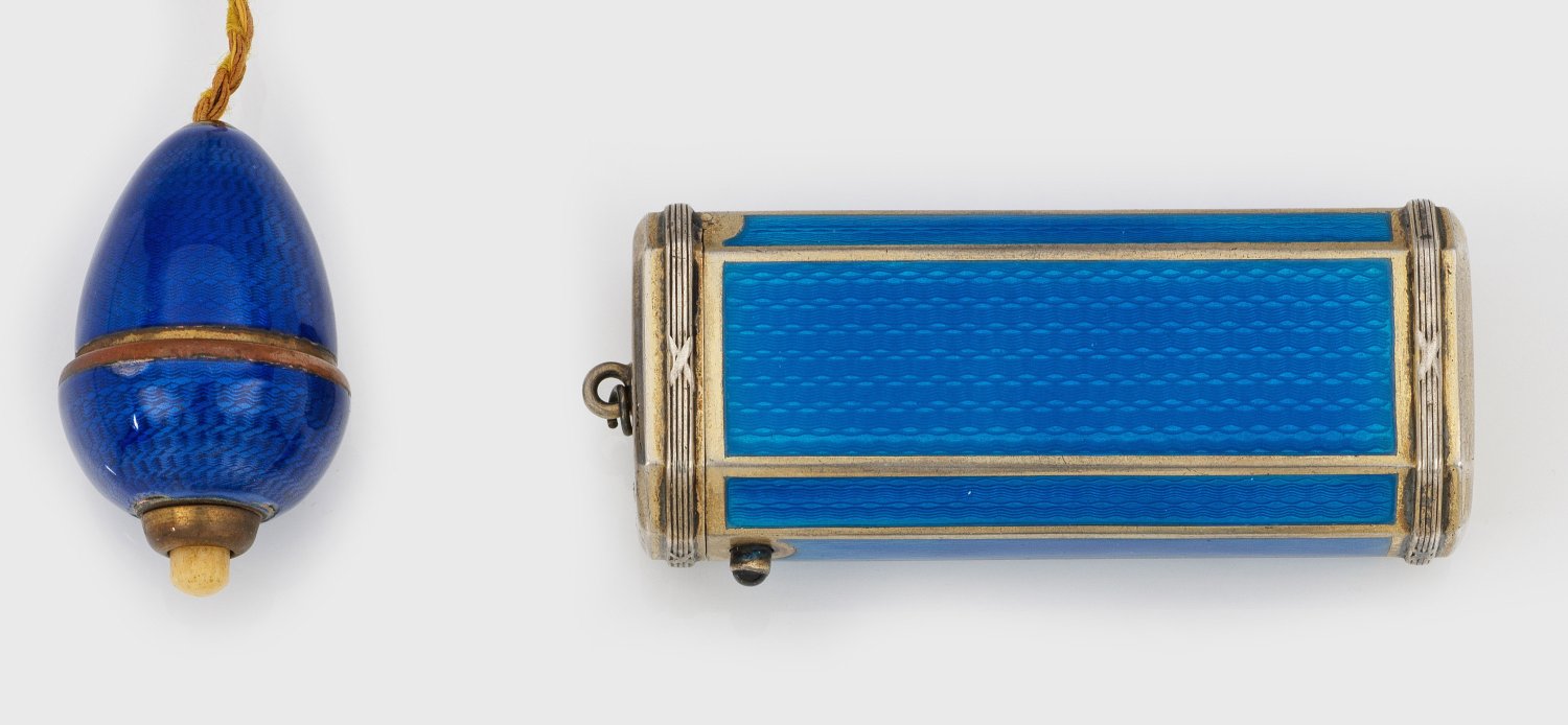 Sterlingsilber, vergoldet sowie Metall. Hochrechteckiges Etui mit Cabochon-Drücker. Guillochierte und blau emaillierte Wandung. Klingel mit Drücker aus Knochen. Minim. best.; Gest. "Sterling Germany". Etui-Gew. 85 g. H. 5 cm - 8,5 cm.