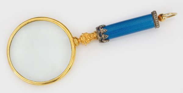 im Stil von Karl Fabergé. Silber, vergoldet und teilw. emailliert. Profilierte Rahmung, übergehend in volutiertes Säulenkapitell. Zylindrischer, royalblau emaillierter Griff über fein guillochiertem Grund. Ansatz in Form einer umlaufenden Krone, Abschlussscheibe besetzt mit Diamantrosen. Darauf runder Knauf, durchzogen mit beweglichem Ring. Gest. 88. Gew. ca. 70 g. L. 13,5 cm. D. 5 cm.