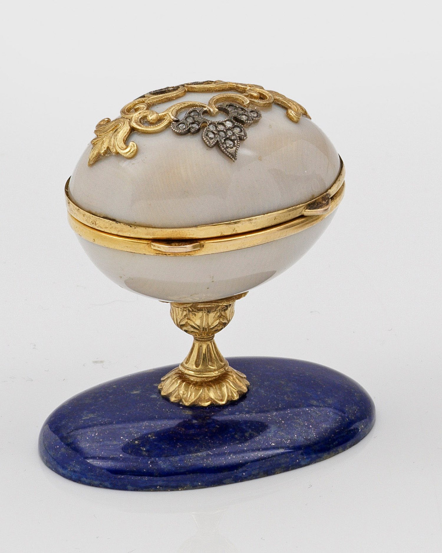 im Stil von Karl Fabergé. Silber, teilw. vergoldet sowie emailliert. Ovaler Sockel aus Lapislazuli, übergehend in kurzen, trompetenförmigen Schaft, umzogen von stilisiertem Blattornamenten und Kanneluren. Darauf quer montiertes, mittig scharniertes Ei, flächendeckend wellenförmig guillochiert und weiß emailliert. Auf der Wandung Blütenkelchornamente, ausgefasst mit Diamantrosen. Innen vergoldet. Am Boden reliefierte Blüte mit rotem Farbcabochon. Gest. 88. Gew. ca. 70 g. H. 6,5 cm. 5,5 cm x 3,8 cm.