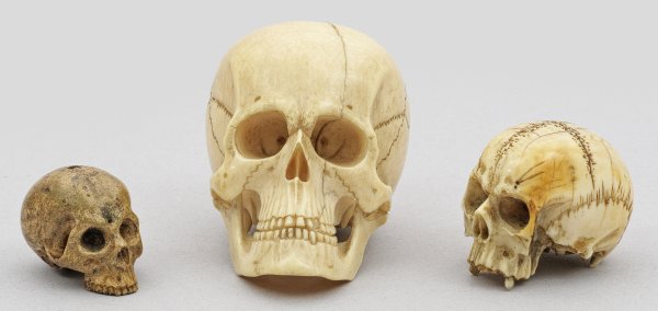Zwei Schädel aus Elfenbein, geschnitzt; ein Schädel wohl aus gebranntem, hellem Pfeifenton mit brauner Alterspatina. Teilw. sehr detailreich ausgeführte Schädel in unterschiedlichen Größen. Bei den zwei Elfenbein-Schädeln sichtbare Sutur, die beiden kleinen Schädeln ohne Unterkiefer und mit teilw. ausgefallen Zähnen zur Betonung des Memento mori-Aspekts, das größte Schädel-Exemplar aus Elfenbein mit sehr fein dargestelltem Unterkiefer und vollständigem Gebiss mit sämtlichen Zähnen. H. 2,2 cm- 5 cm.