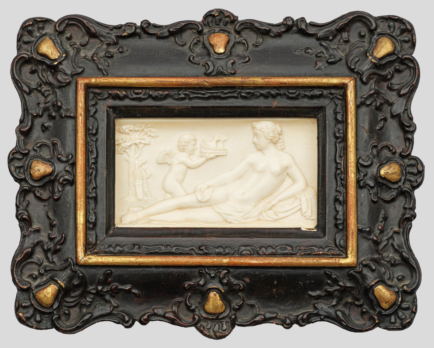 Elfenbein, geschnitzt. Ebonisierter und vergoldeter Holzrahmen mit feinem Rocaillenrelief. Wohl im 2. Viertel des 18. Jhs. entstandene, fein ausgeführte, querrechteckige Tafel. Szenische Darstellung der ruhenden, bis auf ein Tuch unbekleideten Venus, die ihren Körper dem Betrachter zugewendet hat. Sie richtet ihren Blick auf den hinter ihr stehenden Amor, der ihr einen Korb mit einem Taubenpaar als Liebessymbol darbringt, im Hintergrund ein Baum mit dem Pfeilköcher Amors. Relief 5 cm x 9 cm; Rahmen 14,2 cm x 17,8 cm.