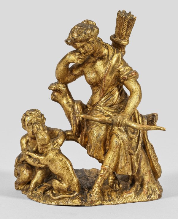 Lindenholz, geschnitzt und vergoldet. Rest.; Vollplastische, im Detail fein ausgeführte, kleine Gruppe mit der auf einem Ast sitzenden Jagdgöttin als Halbakt in sinnierender Pose, zu ihrem Fuß ein Hund, den knienden Putto im Gesicht leckend. Der aus stilistischen Kriterien angenommene Entstehungsort Würzburg stellt die Skulptur in einen Zusammenhang mit der bedeutenden, blühenden Bildhauerkunst von Jakob van der Auwera (1672 - 1760) und seinen Söhnen Johann Wolfgang (1708 - 1756) und Lukas Anton (1710 - 1766), außerdem Ferdinand Tietz (1708 - 1777) und Johann Peter Wagner (1730 - 1809). Als Hofbildhauer der Würzburger Fürstbischöfe schufen sie für diese und andere Auftraggeber nicht nur religiöse, sondern auch weltliche Bildwerke, u. a. für den Veitshöchheimer Schlossgarten und Würzburger Hofgarten der Residenz. H. 16 cm.