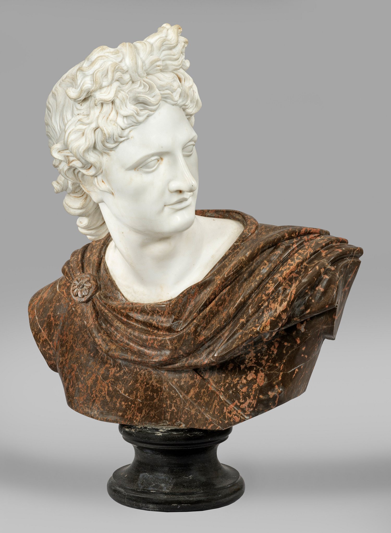 Effektvoll und dekorativ gearbeitet aus zwei unterschiedlichen Steinen - weißem und dunkelbraunem Marmor, die Basis aus dunkelgrauem Belgisch Granit. Büste nach dem Vorbild der berühmten antiken Mamorstatue des "Apollo von Belvedere" in den Vatikanischen Museen in Rom, die Ende des 15. Jhs. wiederentdeckt wurde. Seither gilt der Apollo von Belvedere als das herausragende Beispiel klassischer Bildhauerkunst und Schönheit, er prägte besonders die Ästhetik des Klassizismus. H. 77,5 cm.