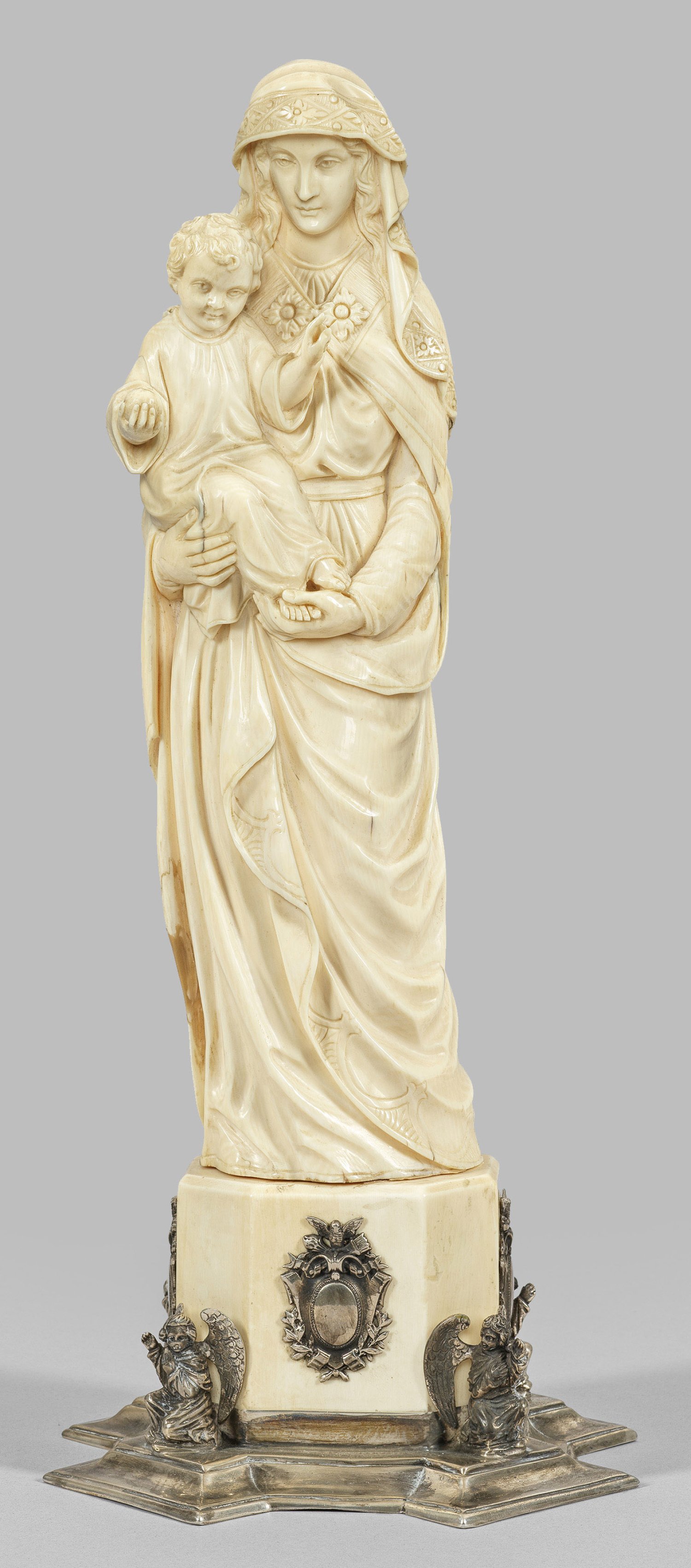 Elfenbein, geschnitzt; Silber (800). Große, fein ausgeführte Statuette in leichtem S-Schwung auf querachteckigem Postamentsockel stehende Maria, der traditionellen Ikonographie entsprechend, in bodenlangem Mantel über einem gegürteten Kleid, auf dem Kopf ein Schleier. Mit beiden Händen trägt diese das Christuskind auf ihrer rechten Seite, welches in der rechten Hand den symbolischen Apfel hält, während es die linke Hand zum Segensgestus erhoben hat. Polygonale, abgetreppte Sockelmontierung mit vier kleinen, vollplastischen, knienden Engeln, eine Hand jeweils zum Gruß erhoben, gest. 800. An vier Hauptseiten des Elfenbeinsockels außerdem ovale, allegorische Reliefkartuschen aus Silber. Ges.-H. 37 cm.