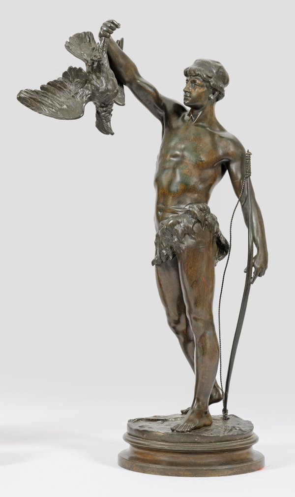 Bronze, dunkel patiniert. Sign.; Vollplastische Statuette des Jünglings als Halbakt mit Bogen, in der erhobenen rechten Hand triumphierend einen erlegten Wildvogel haltend. Der an der École des Beaux-Arts ausgebildete Bildhauer gehört zu den bekannten Künstlern der Belle Époque und beschickte 1883-1903 den Salon regelmäßig mit Statuen und Büsten. H. 56,5 cm.