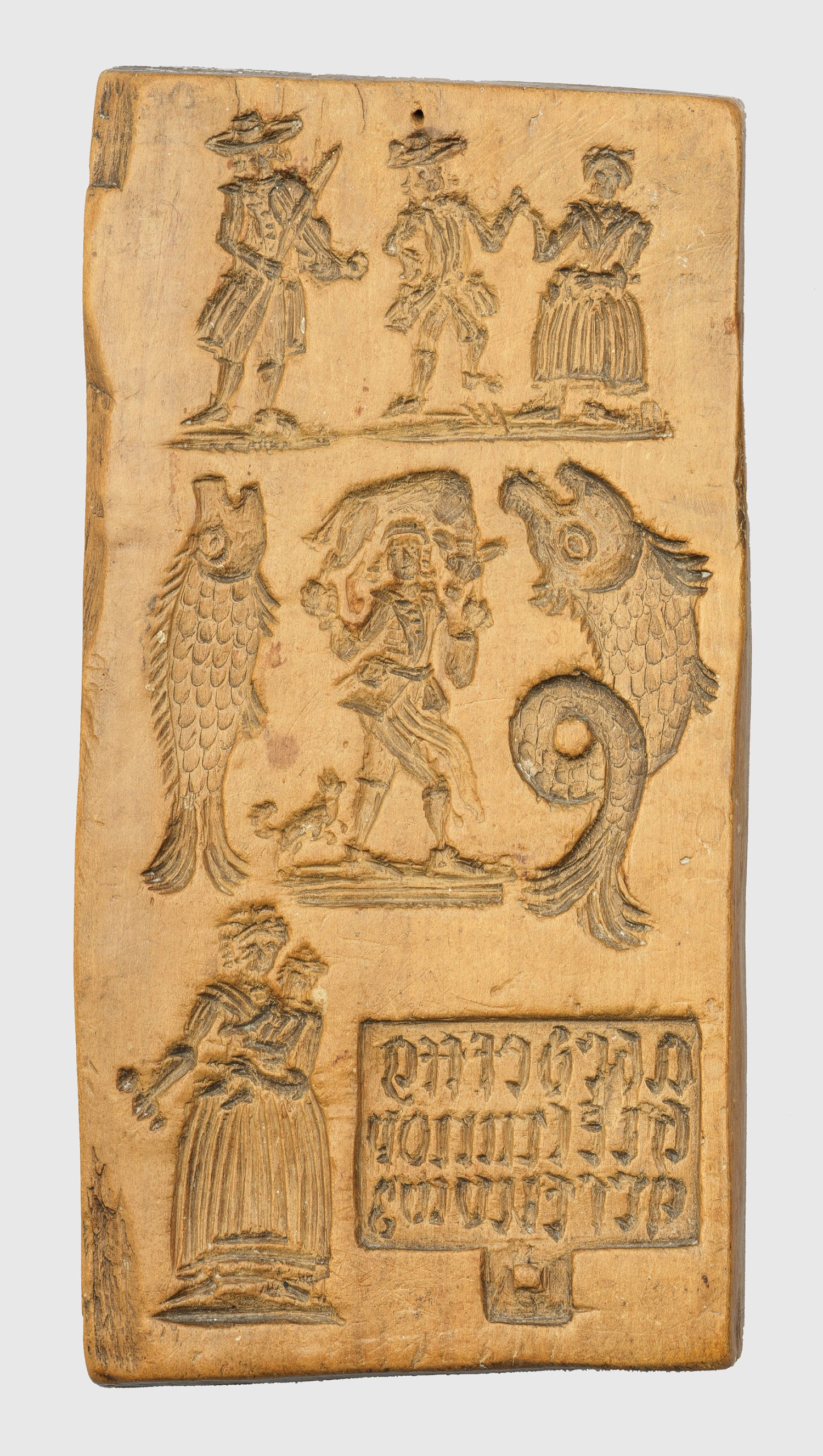 Holz, geschnitzt. Rechteckige Form. Vertieft und spiegelverkehrt auf der Vorderseite ein Geigenspieler, ein tanzendes Paar, zwei Fische, ein Jäger mit geschulterter Beute und Hund, eine Mutter mit Kind und eine Tafel mit dem ABC. Rücks. eine Dame mit Hut, eine einspännige Kutsche sowie ein berittener Mann mit Dreispitz und Hund. 13,5 cm x 26,5 cm.