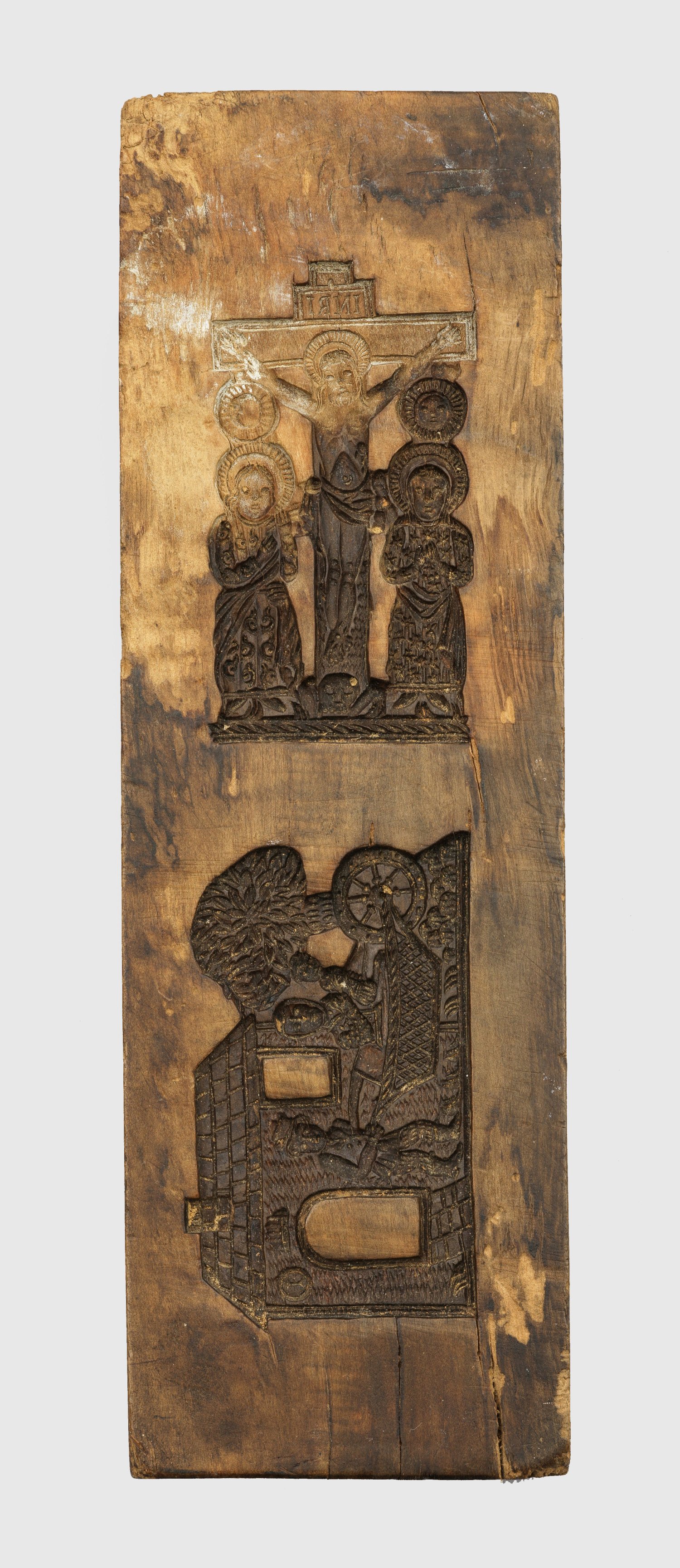 A South German carved wooden baking mold with the crucifixion scene of Jesus and a man pushing a woman and a child past a house. Age-related signs of use.