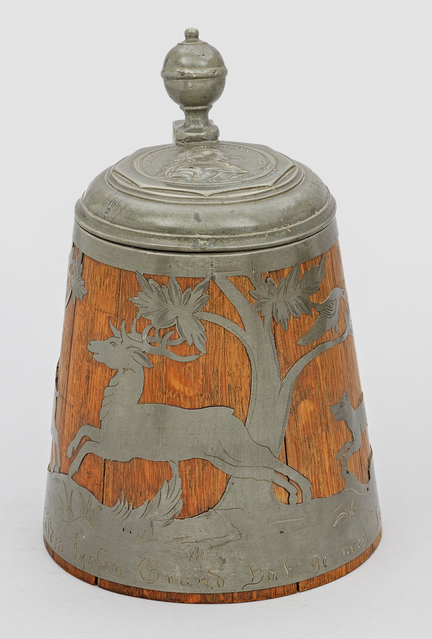 Zinn und Holz. Sich konisch verjüngender Korpus. Holzwandung mit umlaufend durchbrochen gearbeiteter Zinnmontierung mit flüchtendem Hirsch, Wildschwein, Eichhörnchen und Vogel auf Baum sowie Jagdhund und Jäger. Über dem Stand die Inschrift: "In des Waldes tüefen Grund hab üe meü Freud gesund". Seitlich großer, geschweifter Bandhenkel mit kugeliger Daumenrast. Auf Deckel in profilierter, achteckig und rund gerahmter Kartusche eine Profilansicht von König Friederich II. von Preußen mit der umlaufenden Inschrift "Fridericus Borussorum Rex Invictus". H. 28 cm.