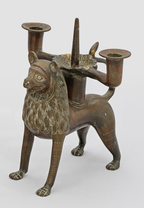 Bronze. Stehender Löwe mit geöffnetem Maul und heraushängender Zunge. Auf seinem Rücken Leuchterschaft mit Dorn, der Schwanz als Griff gearbeitet. Nachbildung eines Leuchters aus dem Hildesheimer Domschatz. H. 26 cm.