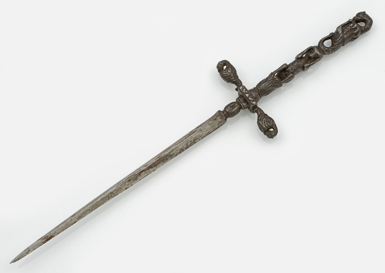 Spitz zulaufende, dreikantige Klinge aus Eisen. In durchbrochen gearbeiteten reliefplastischen Wyvern endende Parierstange. Griff ebenfalls durchbrochen gearbeitet mit sitzendem Affen. Altersbedingte Gebrauchsspuren, Klinge minim. korrodiert. L. 27 cm.