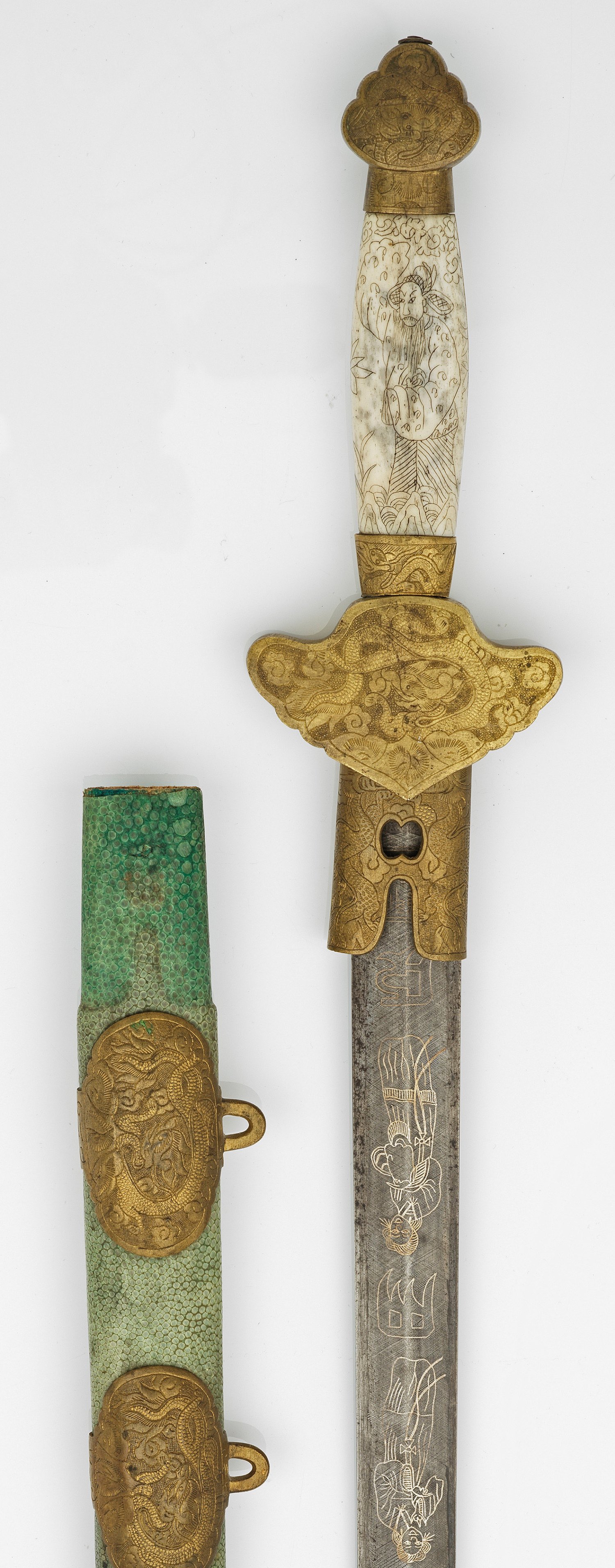 Gerade, zweischneidige, ungeschärfte Klinge mit beidseitiger, flach aufgelegter Darstellung von Figuren und Schriftzeichen. Beschnitzter Griff aus Knochen mit Knauf, mit figuralen Darstellungen. Parierstange aus Messing mit gravierten Drachen. Holzscheide mit grünlicher Rochenhaut umwickelt, Metallbeschläge sowie teilw. Ringösen. L. (in Scheide) 75 cm.