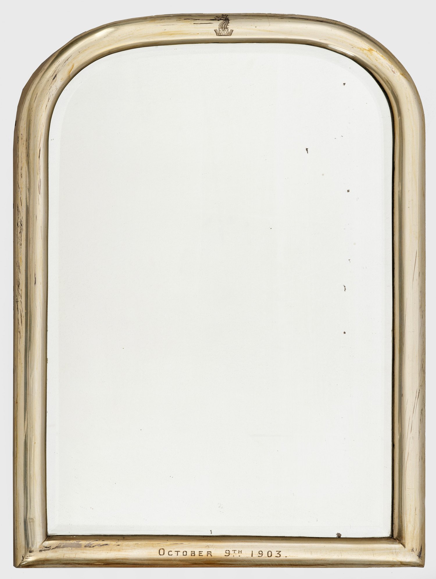 Sterlingsilber und Holz. Hochrechteckige Form, oberhalb mit gerundeten Ecken. Gerundete, elegante Leiste mit graviertem Crest in Form eines Drachenkopfes sowie dat. "October 9th 1903.". Facettierter Spiegel. Rückwand aus Eichenholz. Gest., Beschaumarken, Herstellerzeichen, Jahresbuchstaben "a". 45 cm x 32,5 cm.