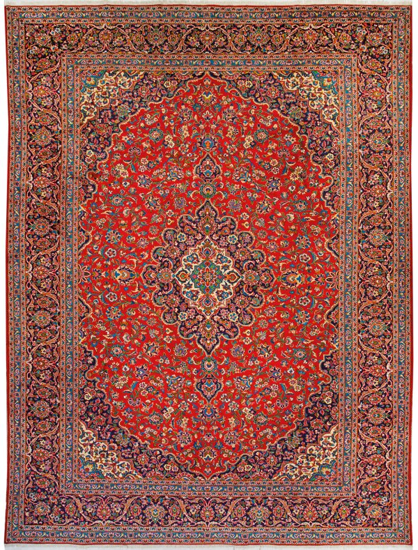 Persien. Wolle auf Baumwolle. Im roten Innenfeld dunkelblaues Zentralmedaillon mit Anhängern sowie breite, korrespondierende Ecklösungen. Flächendeckend dichte Musterung aus üppigen Blütenranken sowie umlaufend breite, dunkelgrundige Palmettenbordüre, flankiert von schmalen Borten. 430 cm x 322 cm.