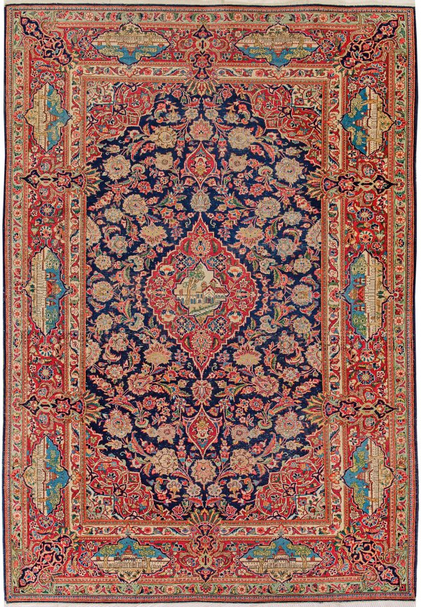 Persien. 1. Hälfte 20. Jh.; Wolle und Seide auf Baumwolle. Feine Knüpfung. Im dunkelblauen Innenfeld gestrecktes Zentralmedaillon mit Anhängern sowie Reserve mit Architekturdarstellung. Flächendeckend dichte Musterung aus Blütenrispen. Rote Ecklösungen sowie umlaufend entsprechende Bordüre mit Architekturkartuschen. Altersspuren. 133 cm x 200 cm.