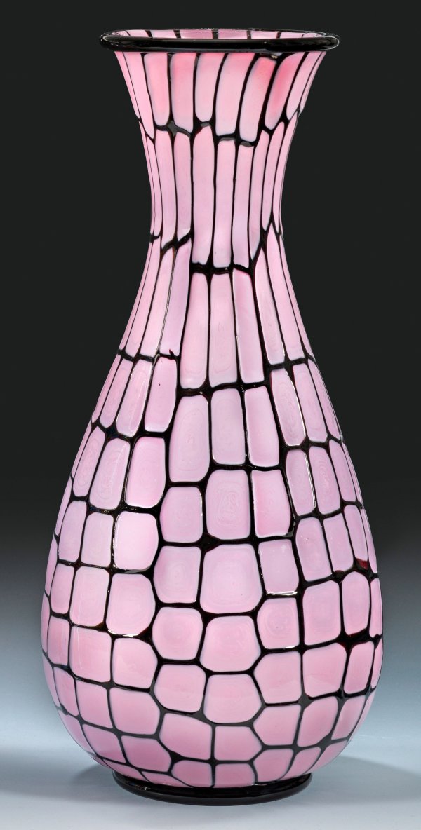 Schwarzes Glas, Glasauflagen in Murinnenform den kompletten Korpus überziehend, in feinem Blasslila. Wohl Barovier & Toso. H. 43,5 cm.