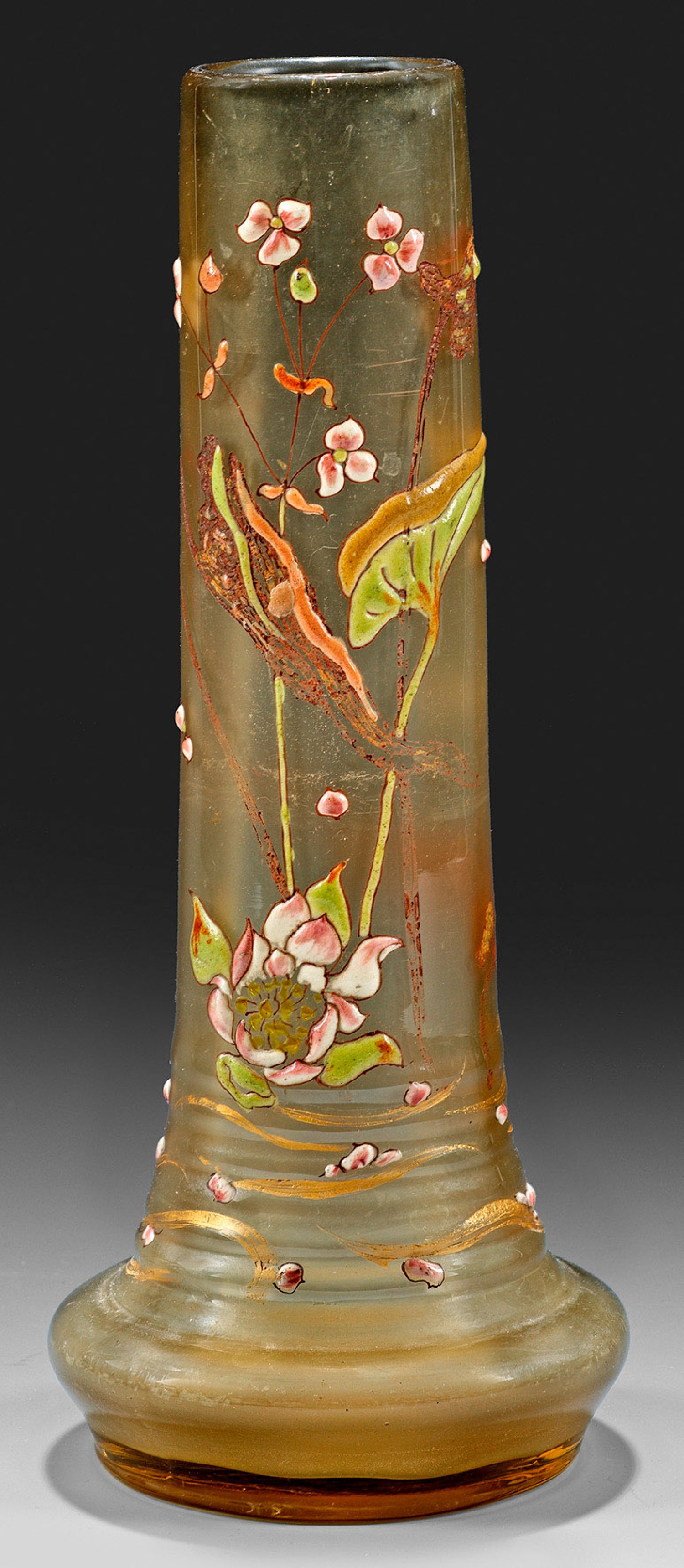 Unterhalb ausschwingende und horizontal gerippte Stangenform. Rauchfarbenes, längsoptisch geblasenes, innen leicht satiniertes Glas. Dekor aus Sumpf- bzw. Wasserpflanzen, geätzt und kombiniert mit polychromer, opaker Emailmalerei sowie Goldmalerei. Sign. (in braun ausgeriebener Nadelätzung) am Boden mit stilisiertem Blatt sowie Blüten "Cristallerie de Gallé à Nancy (/) Modèle et décor déposés", außerdem Ziffer "17"(?). H. 21,5 cm.
