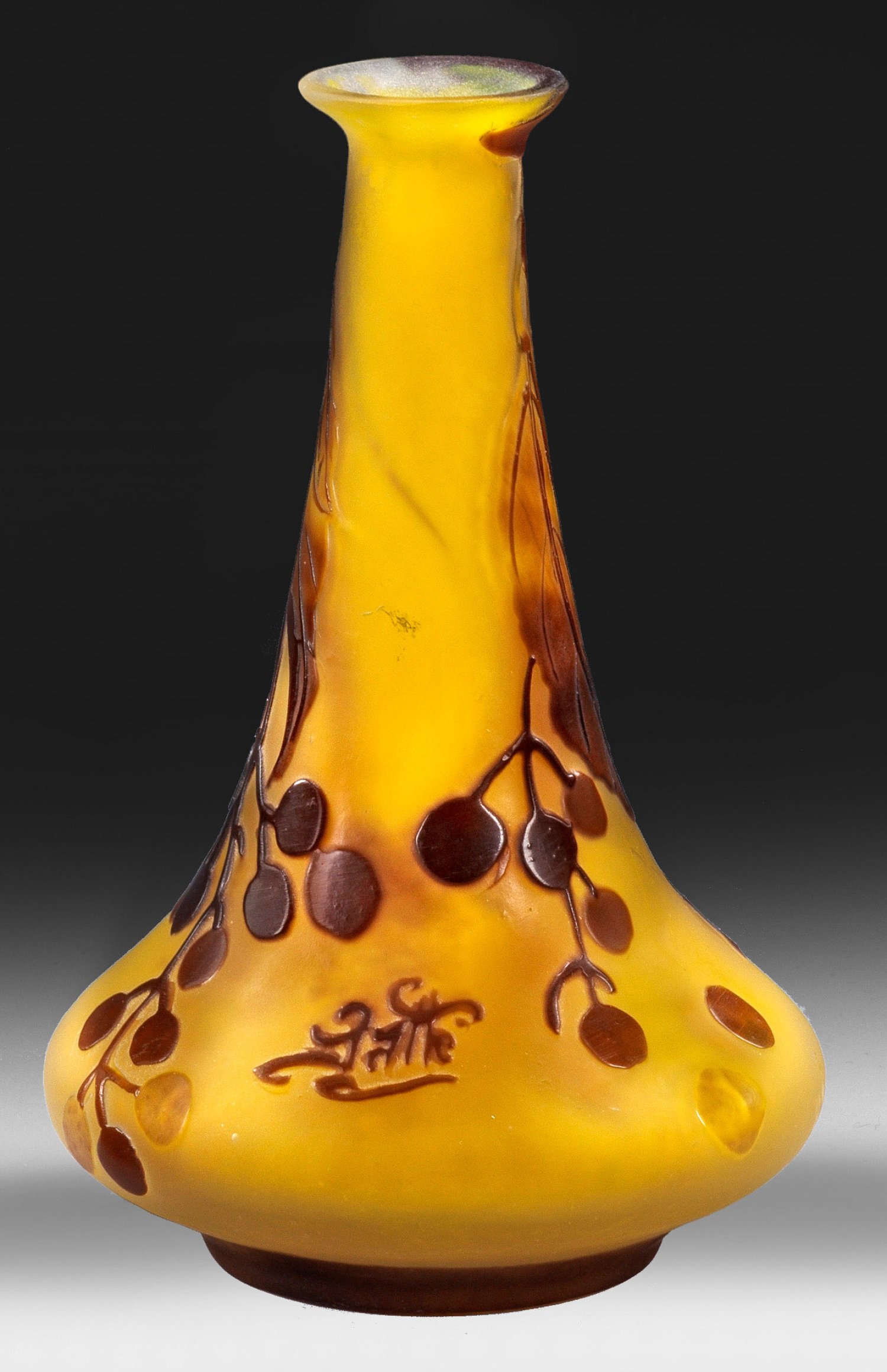 Schlanke, nach unten stark ausschwingende Form. Farbloses Glas mit gelbem Unterfang. Auberginefarbener Überfang. Geätzter Wilder-Wein-Dekor. Sign. "Gallé". Minim. Glasabsprung im unteren Drittel. H. 10,5 cm