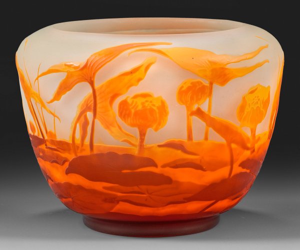 Gedrückt-ovoide Form mit weiter, eingezogener Mündung. Überfangglas, farblos, gelborange und dunkelrot. In mehreren Arbeitsgängen ausgeführter, geätzter und partiell nachgeschnittener, polierter Dekor aus einer Teichlandschaft mit See- bzw. Teichrosen sowie Pfeilkraut. Sign. "Gallé". H. 15,5 cm.
