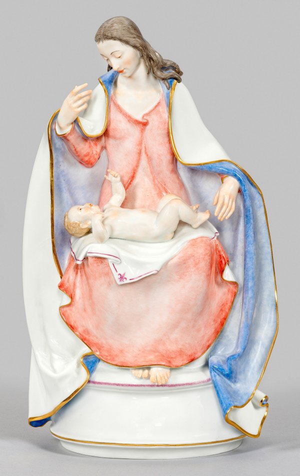 Auf gehöhtem, ovalem Sockel thronende Maria in langem, rotem Gewand sowie weißem Mantel mit blauem Innenfutter. Auf ihrem Schoß liegendes, nacktes Jesuskind auf weißem, verziertem Tuch. Polychrome Malerei mit Goldrand. Entw. Ludwig Nick, um 1928/1930. Modell-Nr. A 1235. Schwertermarke. H. 31,5 cm.