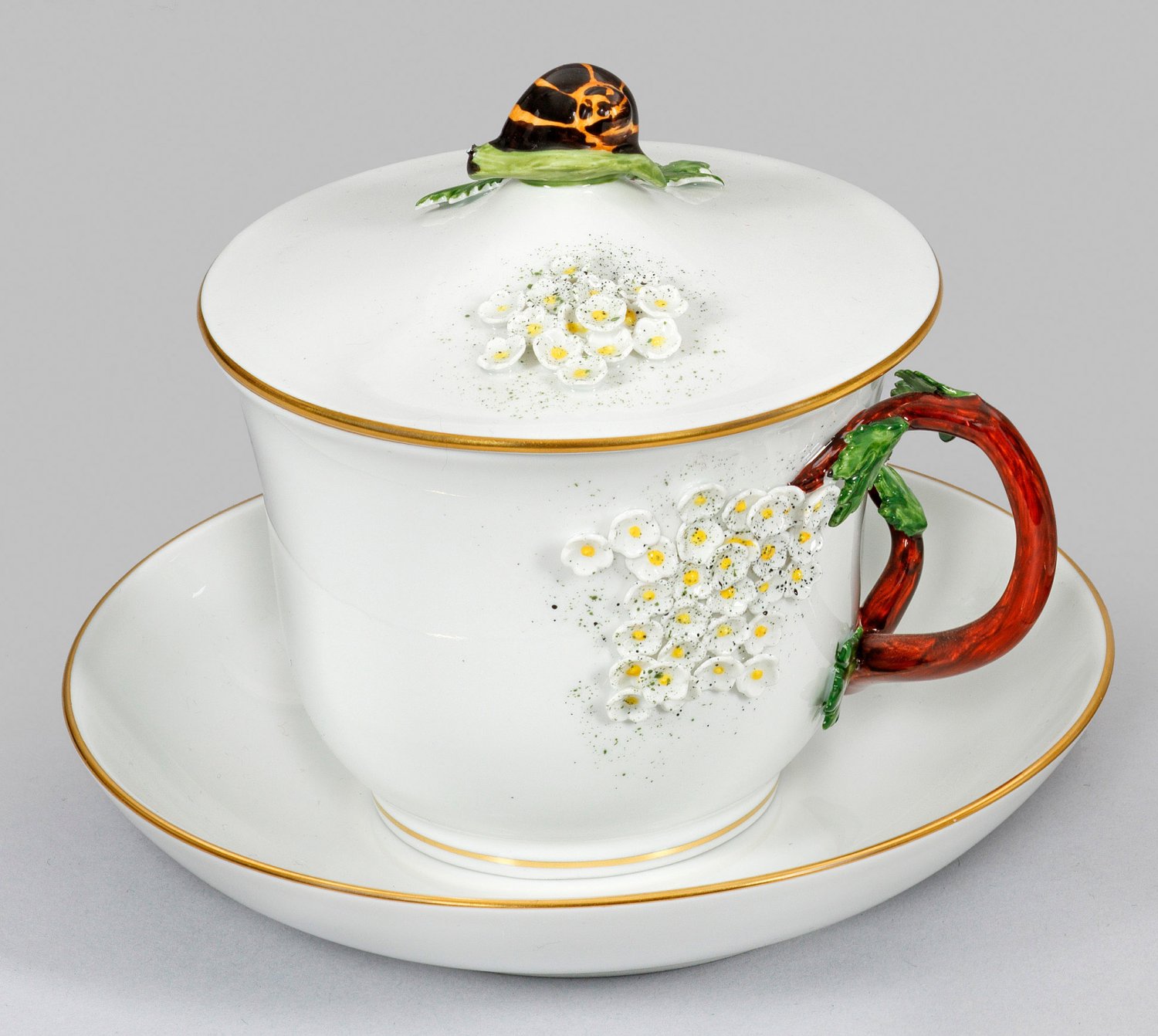 mit Untertasse. Über dem Rundstand Glockenbecherform mit seitlichem Korallengriff und Blättern. Daran anschließend zwei kleine Felder mit Schneeballendekor aus flächendeckenden, aufbossierten, kleinen Blüten und Blütenstaub imitierenden Farbsprenkeln. Korrespondierender Dekor auf dem Deckel, bekrönt von einer plastisch gearbeiteten Schnecke. Polychrome Malerei mit Goldrand. Entw. Gudrun Gaube. Modell-Nr. 55872. Jahreszeichen. Minim. best.; Schwertermarke. Tassen-H. 12,5 cm. Untertassen-D. 16 cm.