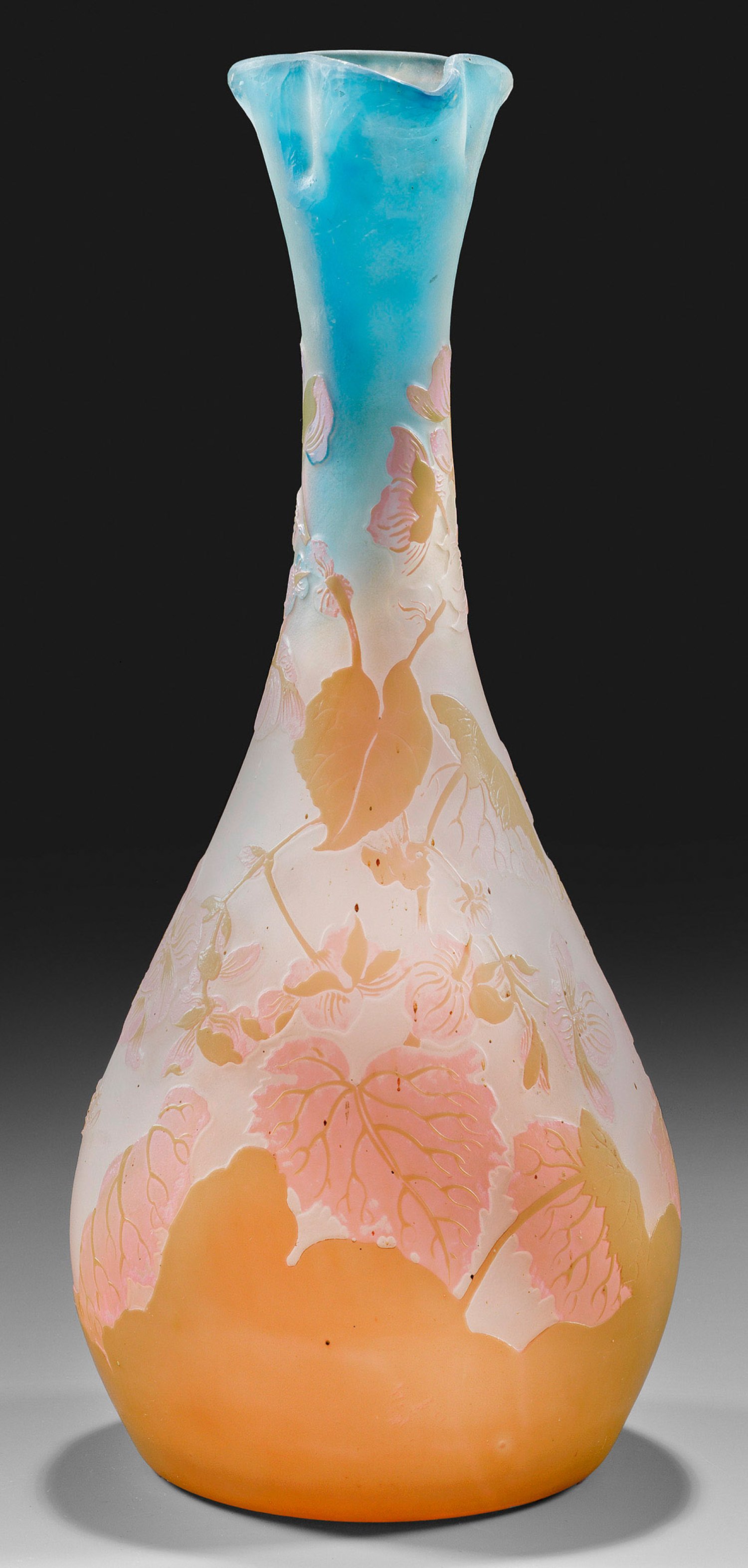 Tropfenförmiger, leicht ins Oval gedrückter Korpus, in einen Enghals einschwingend, dreipassig gekniffene ausgestellte Mündung. Überfangglas, farblos, türkisblau, rosafarben und moosgrün. Farbloses Glas, violett überfangen. In mehreren Arbeitsgängen geätzter Dekor aus blühenden Pelargonien (bzw. sog. Geranien) vor mattem Grund. Sign. "Gallé" mit Stern. H. 38 cm.