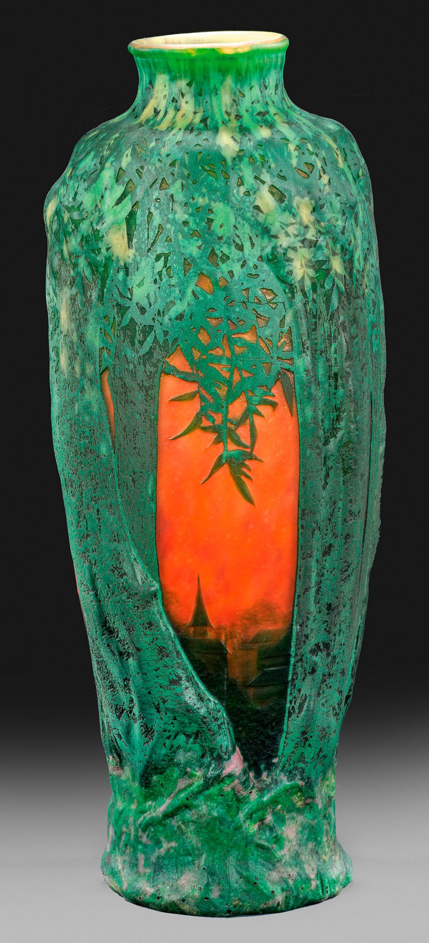 Schlanke, unregelmäßige Balusterform. Überfangglas mit mehrfarbigem, ein- und aufgeschmolzenem Pulver, in Soufflé-Moulé-Technik in ein Model geblasen. Stark reliefplastischer Dekor, geätzt und geschnitten, matte bis poröse Oberfläche: belaubte Weidenstämme vor einem Kirchdorf im Abendrot als Hintergrund. Am Boden geschnittene Sign. "DAUM NANCY" mit Lothringer Kreuz. H. 29,5 cm.