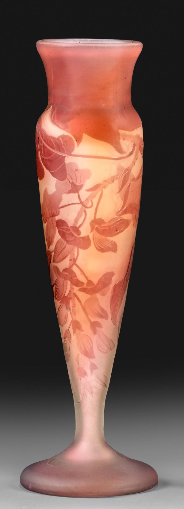 Kelchform mit ausgezogenem Lippenrand. Überfangglas, farblos, apricotfarben und Magentatöne. In mehreren Arbeitsgängen geätzter und polierter, umlaufender Dekor aus blühenden Ranken von Blauregen (bzw. Glyzinien oder Wisteria) vor mattem Grund. Drei Streublumen am Fuß. Sign. Gallé. H. 24 cm.