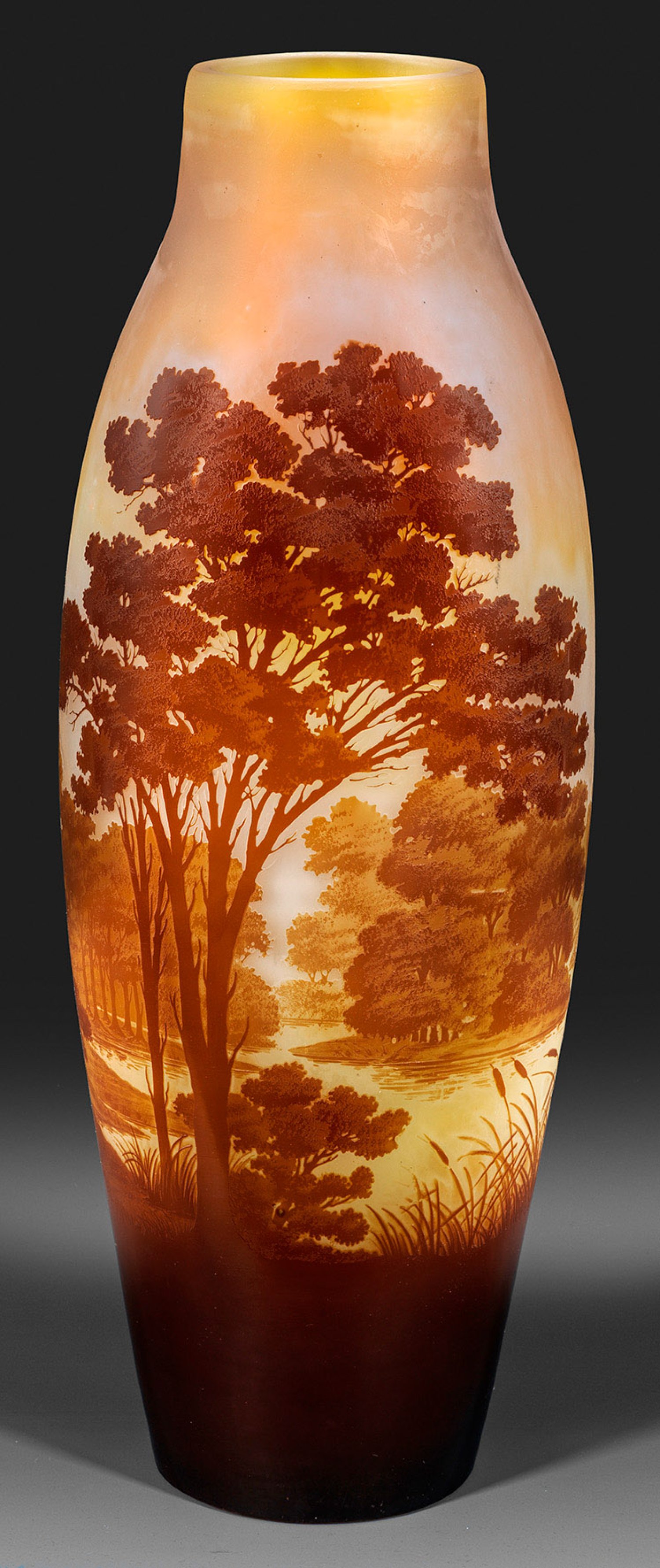 A large French cameo glass vase by Gallé with acid-etched decor of a river landscape. Signed.