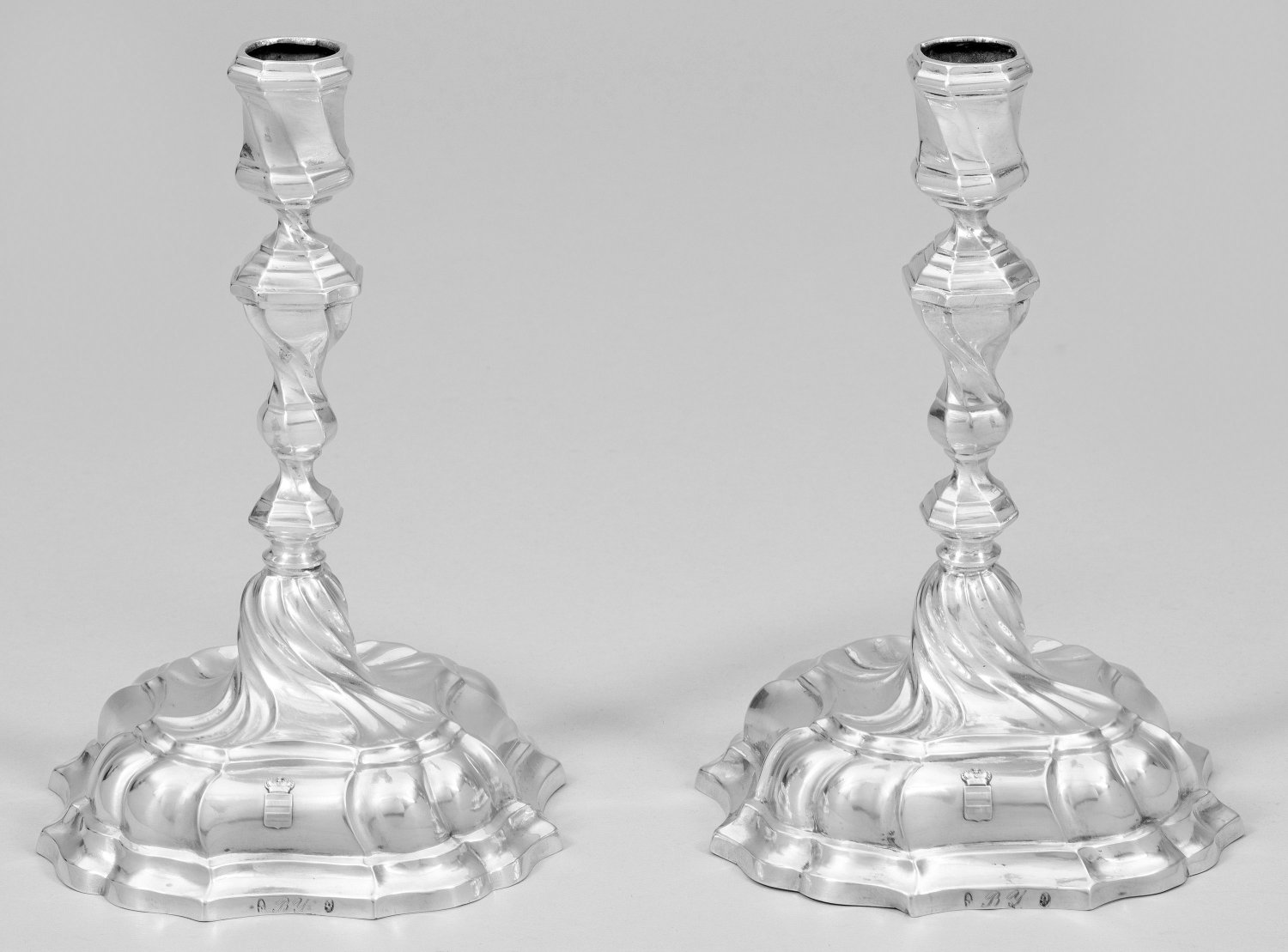 A pair of German Rococo silver candlesticks with the coat of arms of the Principality of Isenburg-Birstein by Johann Jakob II Biller (master since 1746). Test, city and master´s mark. Monogrammed.
