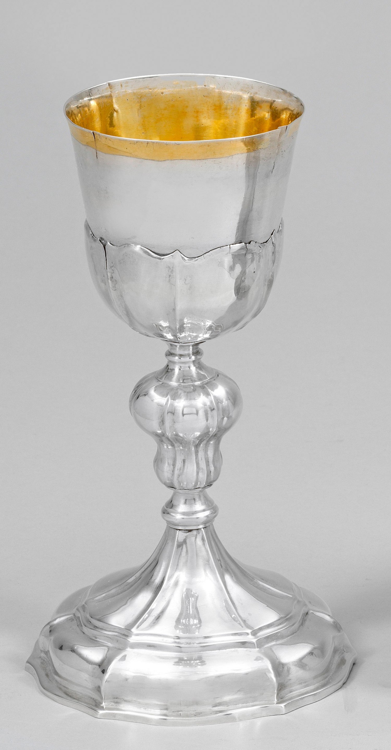 Silber, teilw. vergoldet. Sechsfach passig geschweifter Stand mit ausgestelltem Rand, Balusterschaft und leicht konische, in der Unterhälfte von Blütenblattdekor umgebene Kuppa. Besch.; Undeutl. Beschau- und Meisterzeichen "FC". Gew. ca. 268 g. H. 21 cm.