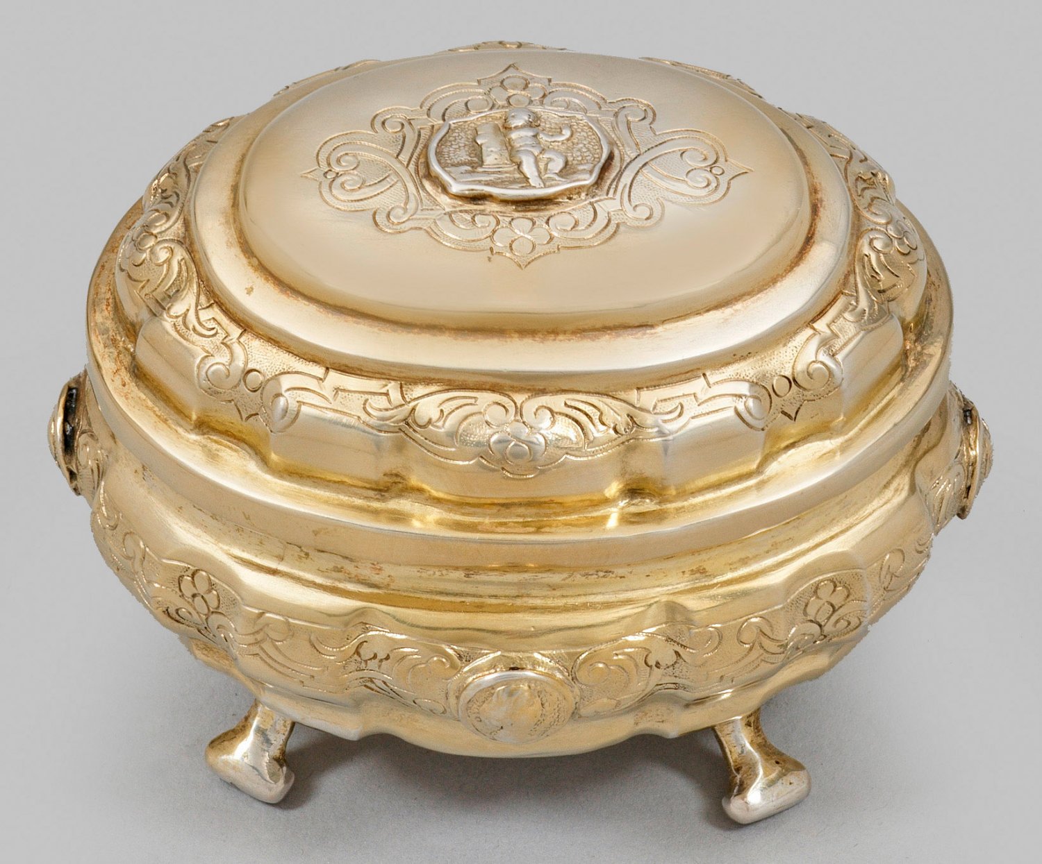 Silber, vergoldet. Auf vier Füßen ovaler Korpus mit geraden Zügen und vier Porträtmedaillons. Wandung und Stülpdeckel mit Reliefmedaillons zwischen graviertem Bandelwerk. Unterseitig monogr. "JB". Gest. Tremolierstich, Beschauzeichen, Meister Christoph II Saler (wird Meister 1692). Gew. ca. 80 g. H. 5,4 cm. 7,3 cm x 5,9 cm.