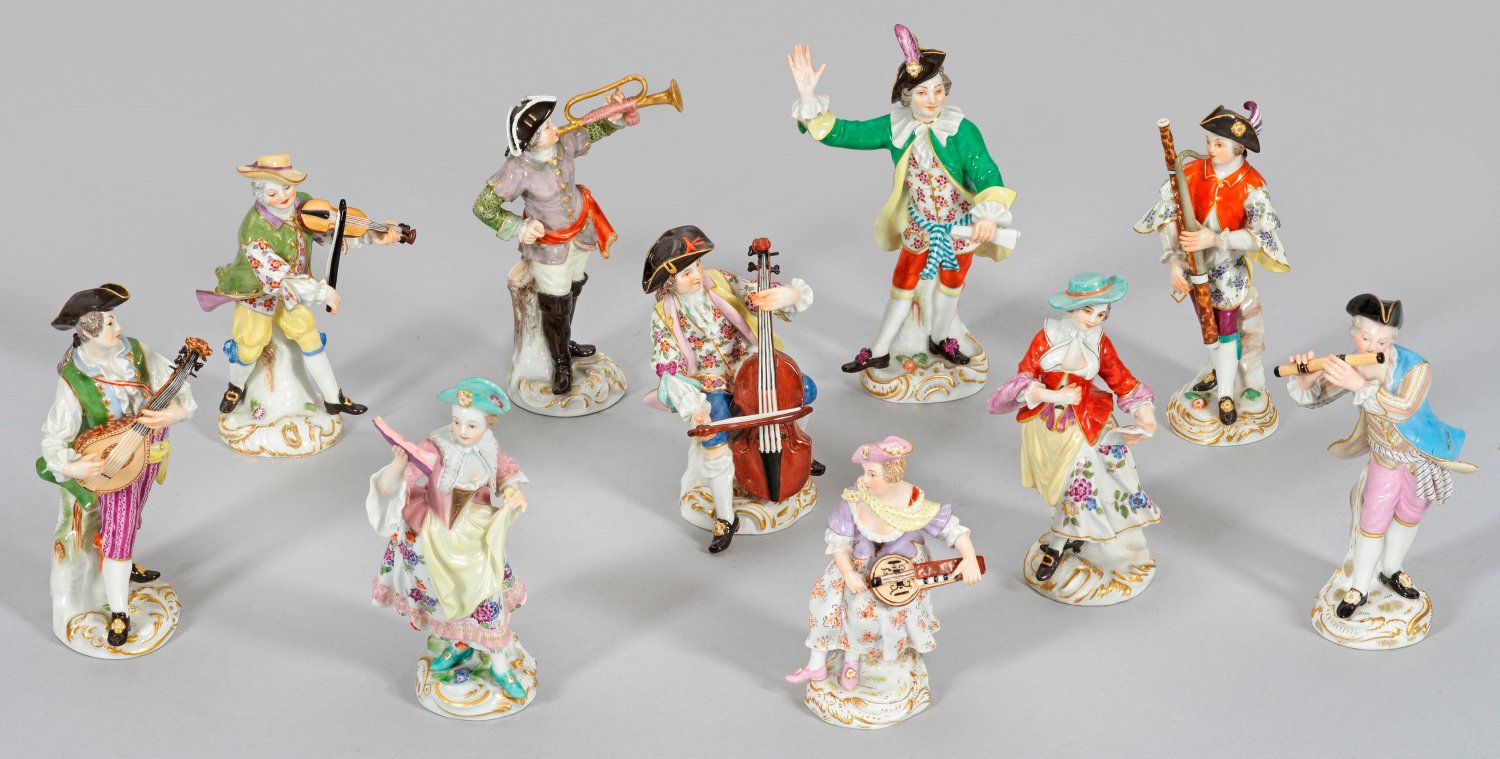 Auf rocaillereliefiertem Sockel stehender Dirigent, Flötist, Fagottist, Geiger, Trompeter, Cellist, Lautenspieler sowie zwei stehende Sängerinnen und Drehleierspielerin. Polychrome Malerei mit Goldstaffage. Entw. Friedrich Elias Meyer und Johann Joachim Kaendler. Polychrome Malerei mit Goldstaffage. Modell-Nr. 1, 2, 3, 4, 7, 9, 10, 12 sowie 60033 und 60035. Teilw. partiell rest./best.; Spannungsriss. Schwertermarke. H. 11,5 cm - 16 cm.