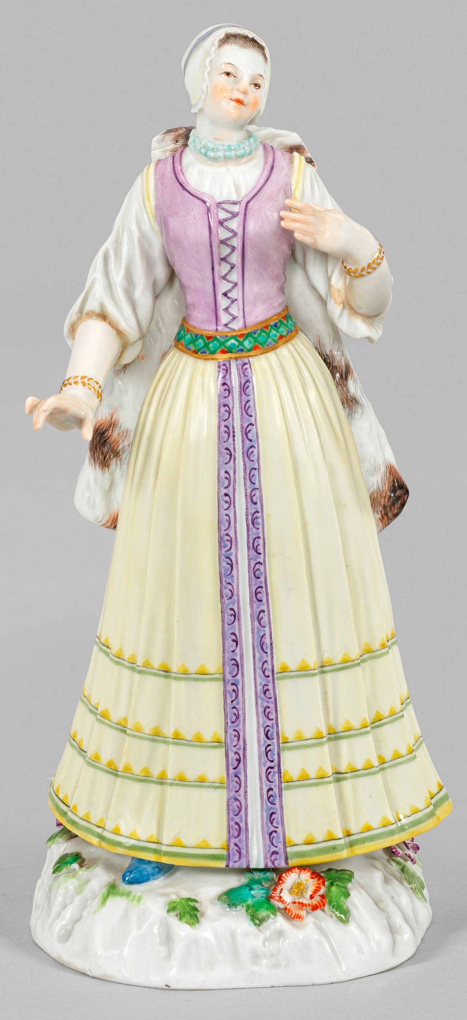 Auf leicht gewölbtem, mit Blättern und Blüten belegtem Ovalsockel stehende Dame in ungarischer Tracht, rückwärtig einen pelzgefütterten Mantel tragend. Polychrome Malerei mit dezenter Goldstaffage. Entw. wohl Johann Joachim Kaendler und Peter Reinicke oder Johann Friedrich Eberlein. Modell-Nr. 1281. Partiell rest.; Schwertermarke. H. 22 cm.