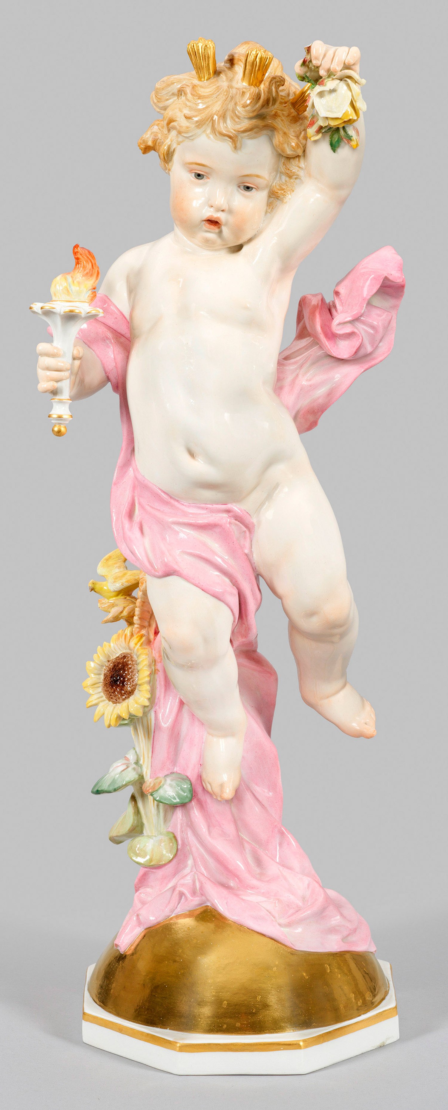 Oktogonale Plinthe. Über Erdkugel schwebender Putto mit rosafarbenem Umhang. Das gelockte Haar mit Strahlenkranz. In der rechten Hand eine brennende Fackel, in der erhobenen Linken einen Rosenzweig haltend, den Tag symbolisierend. Polychrome Malerei mit reicher Goldstaffage. Entw. Heinrich Schwabe. Modell-Nr. L 134. Rest.; Minim. best.; Schwertermarke. H. 51,5 cm.
