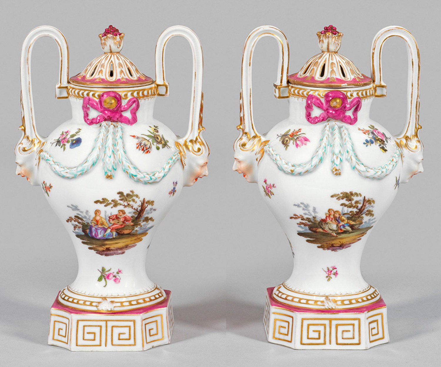 Über eingezogenem Quadratsockel mit Mäanderband amphorenförmiger Korpus mit kurzem zylindrischen Hals. Durchbrochen gearbeiteter Deckel mit Fruchtknauf. Seitlich gebogene Henkel in reliefplastischen Maskarons endend. Beidseitig der Wandung lagernde Paare in baumbestandener Landschaft. Verstreute Blumen. Oberhalb von einer Schleife bekröntes Feston. Polychrome Malerei mit Goldstaffage. Rest.; Deckel rep.; Ber.; Manufakturmarke. H. 23,5 cm.
