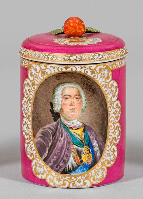 Zylindrischer Korpus mit Ohrenhenkel und reliefiertem Akanthusblatt. Messingmontierter, flach gewölbter Deckel mit plastischem Erdbeerknauf. Farbkräftiger Purpurfond. Schauseitig der Wandung vor steingrauem Grund das Brustbildnis Friedrich August II., Kurfürst von Sachsen und König von Polen August III. (1696-1763) in reich goldornamentierter Ovalreserve. Auf dem Deckel die Königskrone. Modell-Nr. 25. Minim. ber.; Unglasierter Boden mit imitierender Schwertermarke. H. 18 cm.
