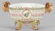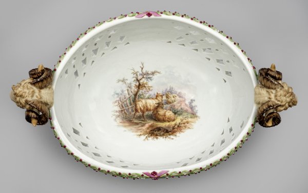 Ovale, durchbrochen gearbeitete Form, von vier ausgestellten Löwentatzen getragen, umzogen von einem Fries aus reliefplastischen Lorbeerzweigen. Seitliche Henkel in Gestalt plastischer Widderköpfe. Beidseitig der Wandung Rundmedaillons mit Vögeln auf einem Ast sitzend. Im Bodenspiegel pittoreske Schafszene in Landschaft. Polychrome Malerei mit reicher Goldstaffage. Entw. Johann Carl Schönheit. Unw. rest.; Minim. best.; Blasse Schwertermarke. H. 19 cm. B. 38 cm.