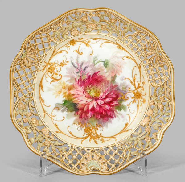 sog. "Pompadour-Form" mit passig geschweiftem Rand. Floral und mit Gitterwerk durchbrochen gearbeitete Fahne. Im leicht vertieften Spiegel ein großflächig angelegtes, dichtes Bukett mit blühenden Chrysanthemen in pastelltoniger, weiß gehöhter Weichmalerei umzogen von feinlinigem Ranken- und Gitterwerk aus Reliefgold. Zepter- und Malereimarke. D. 23,5 cm.