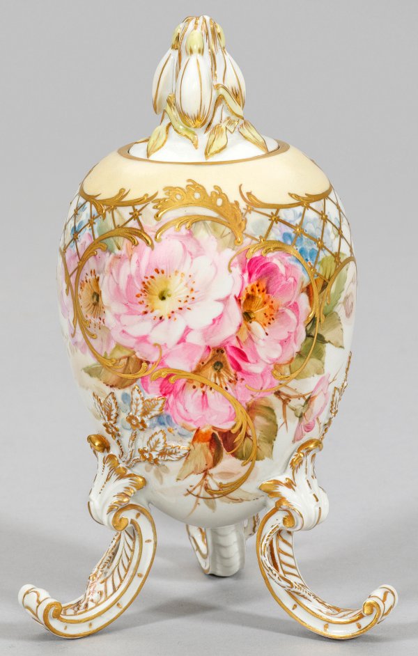 Von drei reliefplastischen, schuppig gerippten Volutenfüßen mit Blattdekor getragener, ovoider Korpus mit eingelassenem Deckel, mittig plastisch aufsteigendem Knauf in Form von Schneeglöckchen. Beidseitig der Wandung farbenprächtige Blumenarrangements überwiegend aus Anemonen und Wildrosen in weicher, polychromer Malerei. Goldstaffage. Umlaufend reicher Reliefgolddekor aus Gitter- und Rankenwerk sowie zartgelbem Fondrand. Minim. rest.; Zeptermarke. H. 16 cm.