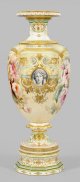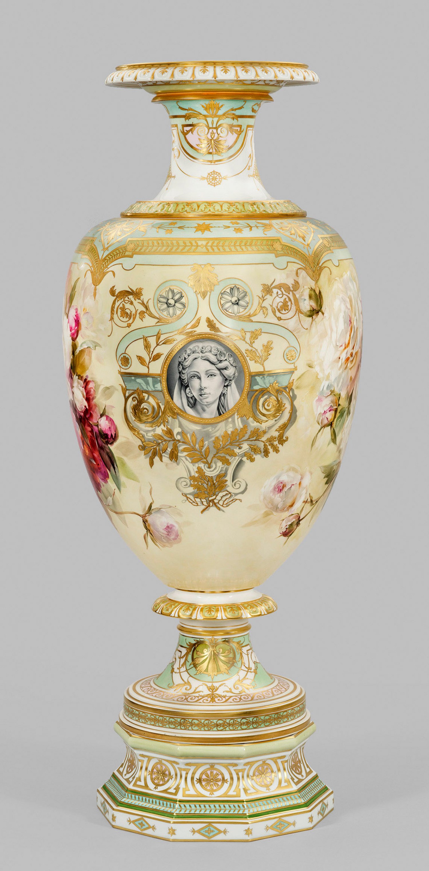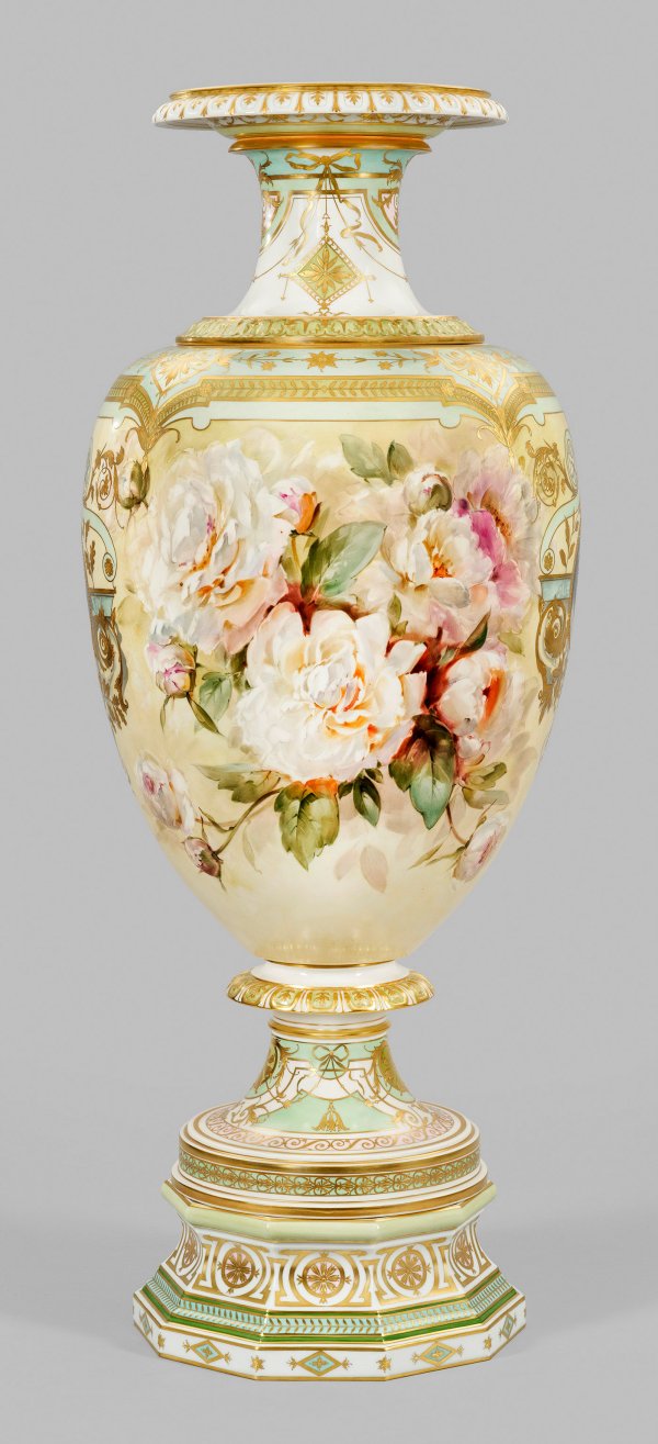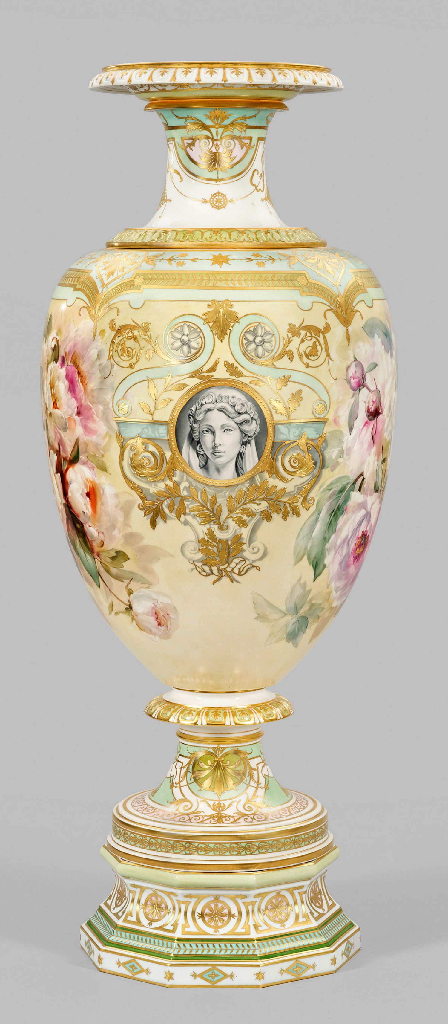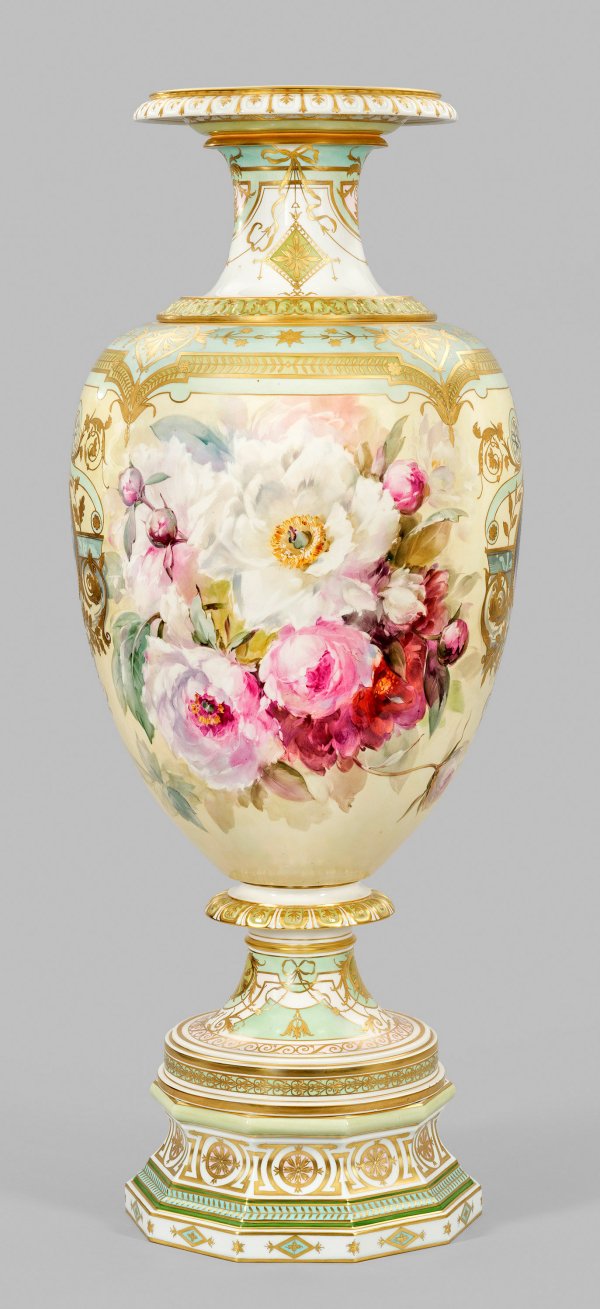 sog. Victoriavase. Oktagonale Basis mit eingezogenem Rundfuß und auskragendem Nodus. Darüber sich aufwölbender, ovoider Korpus mit leicht eingezogenem Rand. Abnehmbarer Deckelaufsatz mit sich im Fuß repetierender und formvollendender Gestalt. Beidseitig der Wandung flächendeckendes, pastelltoniges Arrangement aus blühenden und knospenden Pfingstrosen auf zart gelblich-grün verlaufendem Grund, in virtuos ausgeführter, sog. Weichmalerei. Flankierend zwei runde Profilbildnisse einer jungen Dame „en grisaille“, umzogen von prächtig überbordenden floralen und ornamentalen Reliefgoldbordüren und Einzelmotiven, die sich allseits des Sockels und der Körper auf zart mintgrünem, weißem und roséfarbenem Fond, teilw. kartuschenhaft ausprägen. Form-Entw. Julius Wilhelm Mantel unter der Mitarbeit seines Sohnes Louis, 1860. Modell-Nr. 2214. Minim. rest.; Sockel mit Malereimarke. Vase mit Zepter- und Malereimarke. Gesamt-H. 106 cm. Vasen-H. 73 cm. Sockel-H. 14 cm. Aufsatz-H. 22 cm.