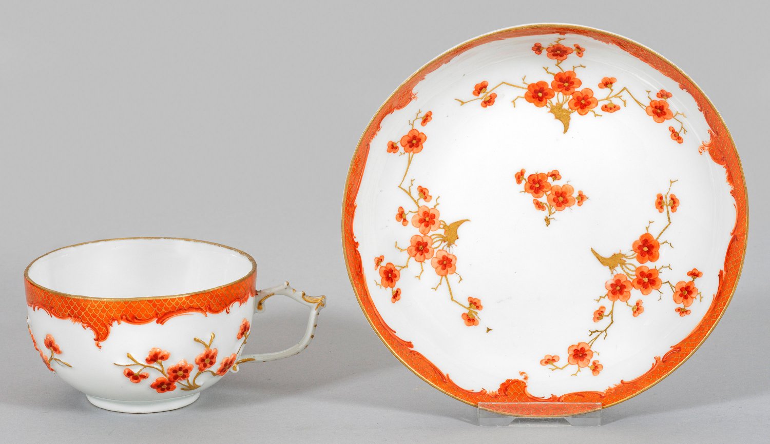 mit Untertasse. Halbkugelig gewölbter Korpus mit geschweiftem Ohrhenkel. Auf der Wandung und im Spiegel feiner Dekor, teilw. im Relief, aus Prunuszweigen umgeben von rocaillegerahmten, goldenen und eisenroten Schuppenmosaikbordüren. Korrespondierende Gestaltung auf der Außenwandung der Untertasse. Eisenrote Camaieumalerei mit Goldstaffage. Press-Nr. 52 und 53. Minim. rest.; Schwertermarke. Tassen-H. 4,8 cm. Untertassen-D. 13,5 cm.
