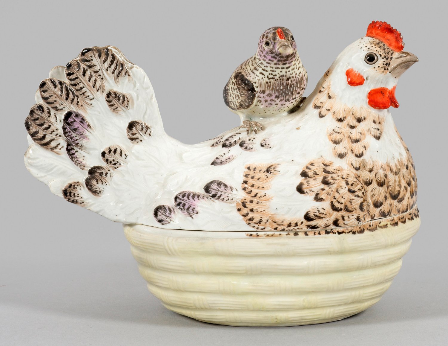 Auf ovalem Flechtkorb sitzende Henne in naturalistischer Ausführung, mit fein reliefiertem Gefieder, auf ihrem Rücken sitzendes Küken. Polychrome Malerei. Entw. wohl Johann Joachim Kaendler. Unw. rest.; Minim. best.; Schwertermarke. H. 15,5 cm. B. 20,5 cm.