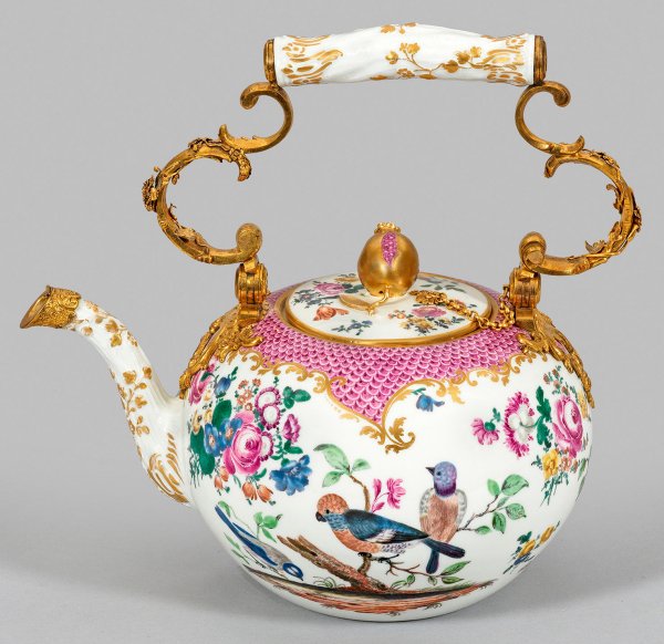 Gedrückt kugeliger Korpus mit flachem, von einem vergoldeten Granatapfel bekröntem Deckel. Frontseitig gebogter Ausguss. Am Ansatz floral reliefierter, übergreifender Henkel aus vergoldeter Bronze mit reliefiertem Porzellangriff. Beidseitig der Wandung auf einer Erdscholle bzw. auf einem Zweig verschiedenartige, sitzende Vögel. Allseits große, natürliche Blütengebinde. Oberhalb von floralen Rocaillen eingefasste Schuppenbordüre. Handhabe und Ausguss mit reliefierter Blütenranke. Feine polychrome Malerei mit Goldstaffage. Unw. rest.; Auf unglasiertem Boden Reste der blassen Schwertermarke. H. 26 cm. B. 27 cm.