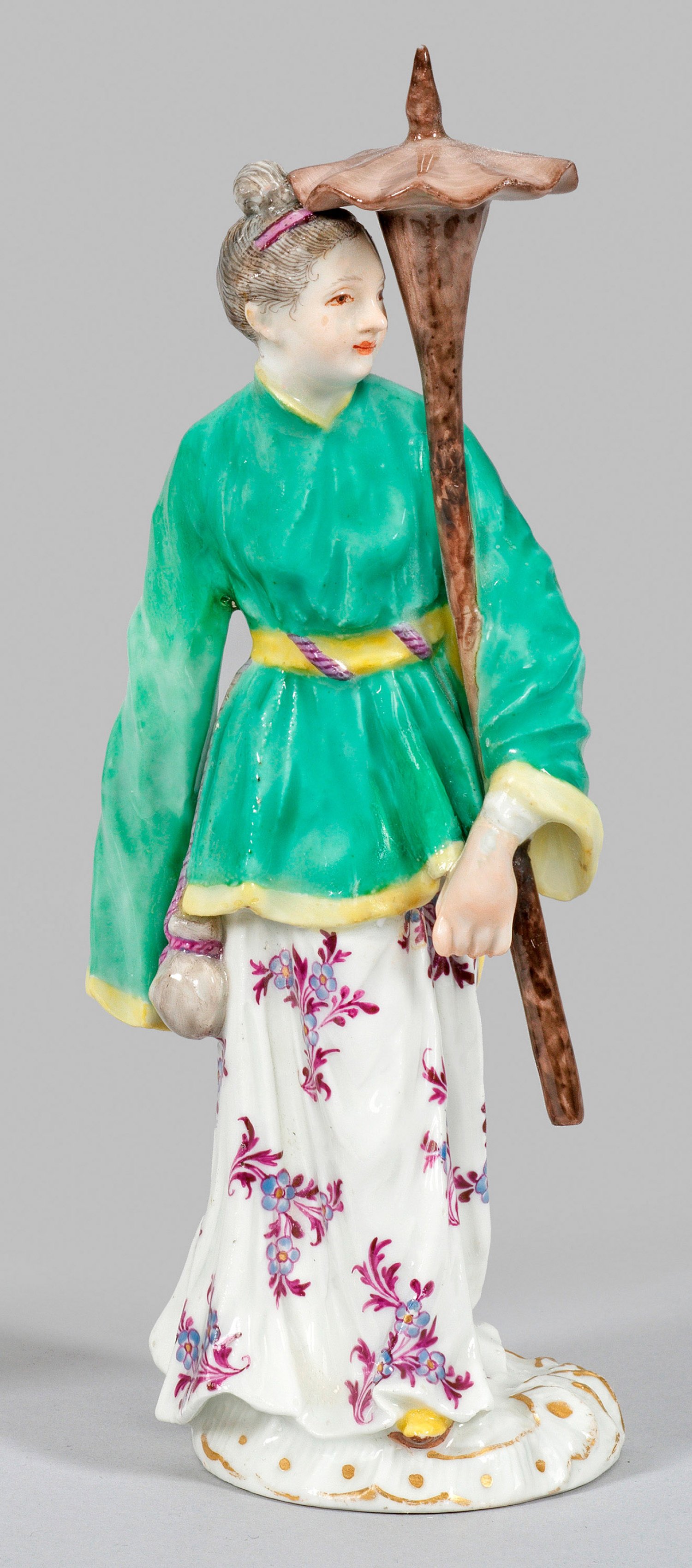 Auf rocaillereliefiertem Sockel stehende Japanerin, gewandet in einen Kimono mit langem, blütengemustertem Rock, mit dem rechten Arm den Sonnenschirm teilw. schützendend über ihr Haupt haltend. Polychrome Malerei mit Goldstaffage. Entw. Johann Joachim Kaendler, 1759. Unw. rest.; Unglasierter Boden. H. 18 cm.