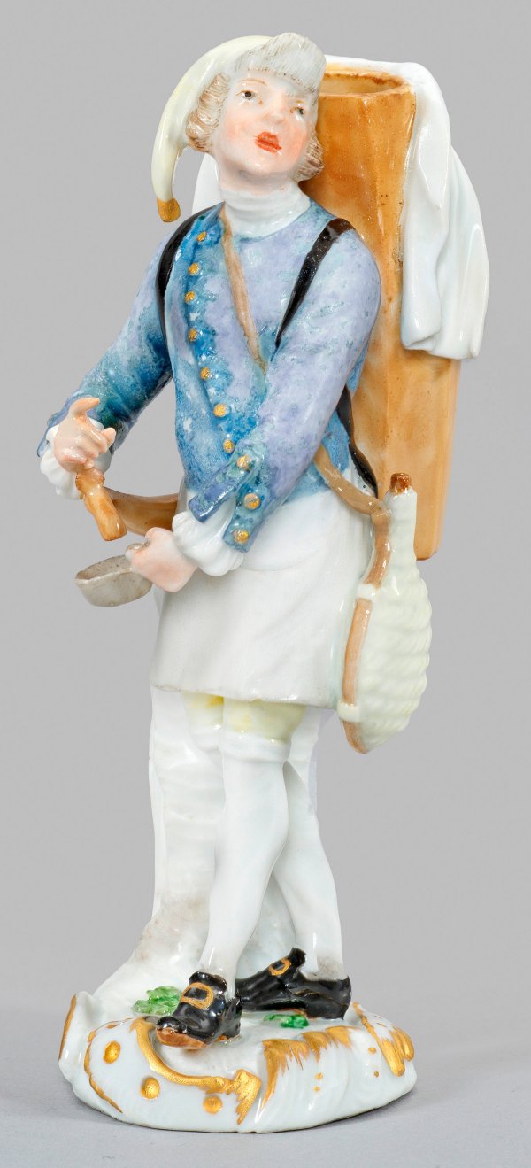 Auf rocaillereliefiertem Sockel stehender Ausrufer, eine Zipfelmütze tragend, auf seinem Rücken eine längliche Kiepe schulternd, aus dessen Zapfhahn er Alkohol in einen Becher in seiner Hand füllt. Seitlich hängende Flasche. Polychrome Malerei mit Goldstaffage. Entw. Peter Reinicke, um 1753 - 1754. Nach einer Vorlage von Christophe Huet. Farbfehler. Minim. rest.; Schwertermarke. H. 14,5 cm.