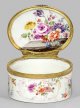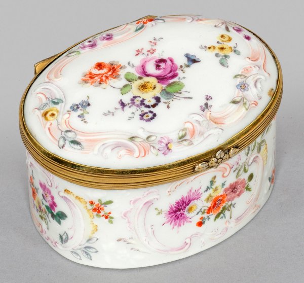 Porzellan. Ovaler, gerader Korpus mit leicht gewölbtem Scharnierdeckel. Allseitig feine, von Reliefrocaillen gerahmte Blumengebinde und Streublumen, Deckelinnenseite mit sommerlichem Blumenstrauß. Polychrome Malerei. Vergoldete Metallmontierung. Minim. rest.; H. 4,5 cm. 8 cm x 6,5 cm.