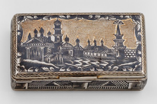 Silber. Rechteckiger Korpus mit Niello-Dekor in Form von Blättern, einer Klosteransicht auf dem scharnierten Deckel und einer Darstellung von Bürger Minin und Fürst Poscharski auf dem Boden. Gest. 84, Beschauzeichen Nikolai Lukitsch Dubrowin (1822 - 1855), ungedeutetes Meisterzeichen. Gew. ca. 80 g. H. 2 cm. 4,5 cm x 7,5 cm.